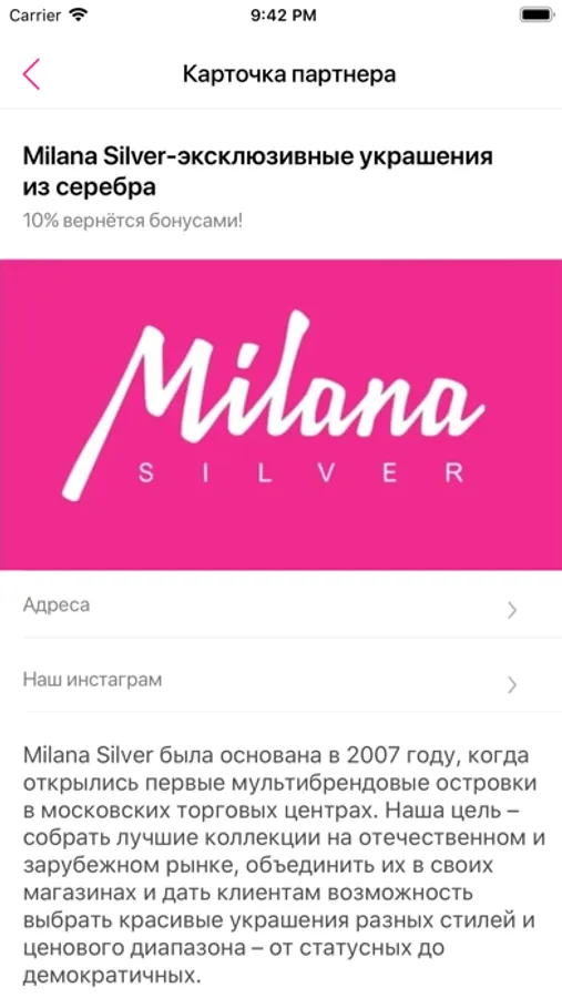 Реализовано брендом "Milana Silver", специально для своих почитателей и клиентов, современного сервиса обслуживания, и конечно же любителей бонусов и скидок в нужное время, в нужном месте!