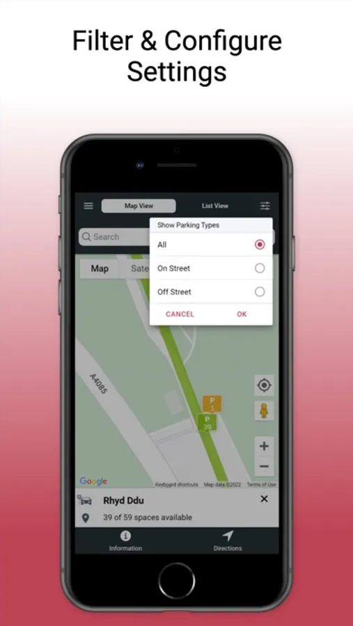 I ddarganfod lle parcio, agorwch yr ap i arddangos y map. Bydd yr eiconau lliw (coch, gwyrdd ag oren) yn cyfeirio tuag at y nifer o lefydd parcio sydd ar gael.