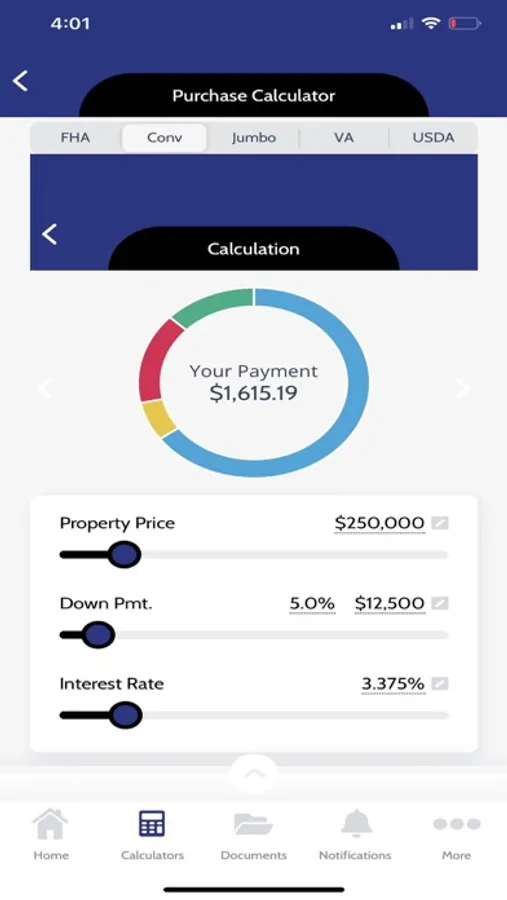 FHA, Conventional, VA, USDA and Jumbo calculations INCLUDING: Mortgage Insurance (MI), HOA, Hazard Insurance and Property Tax components! Explore the home buying process with the Step-By-Step Guide or determine which program is right for you. Receive professional advice and updates on the go with direct messaging and push notifications.
