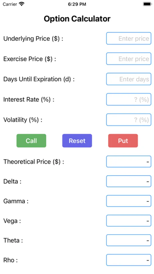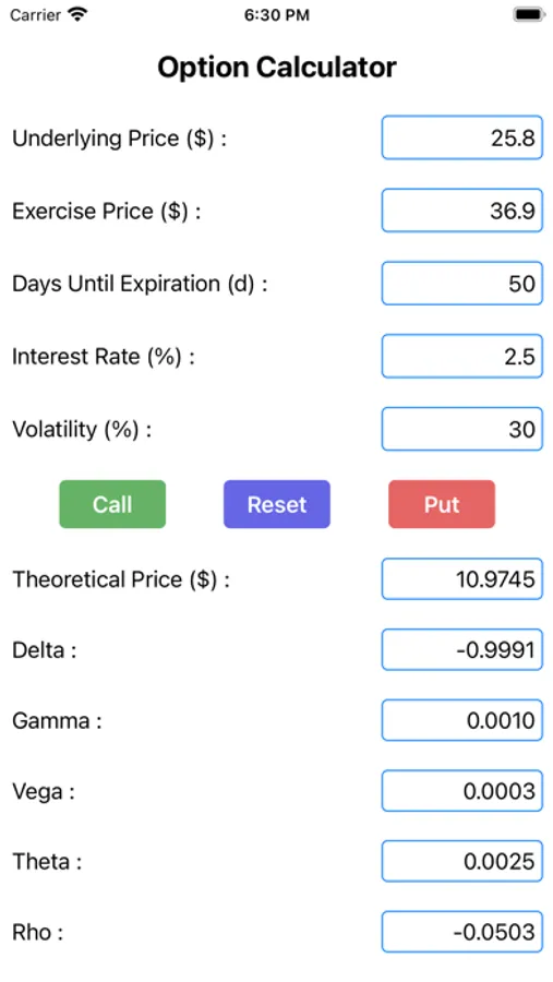 Easy Option Calculator is very easy to use, enter following values, and click button “Call”, or “Put” to get option prices and option Greeks: