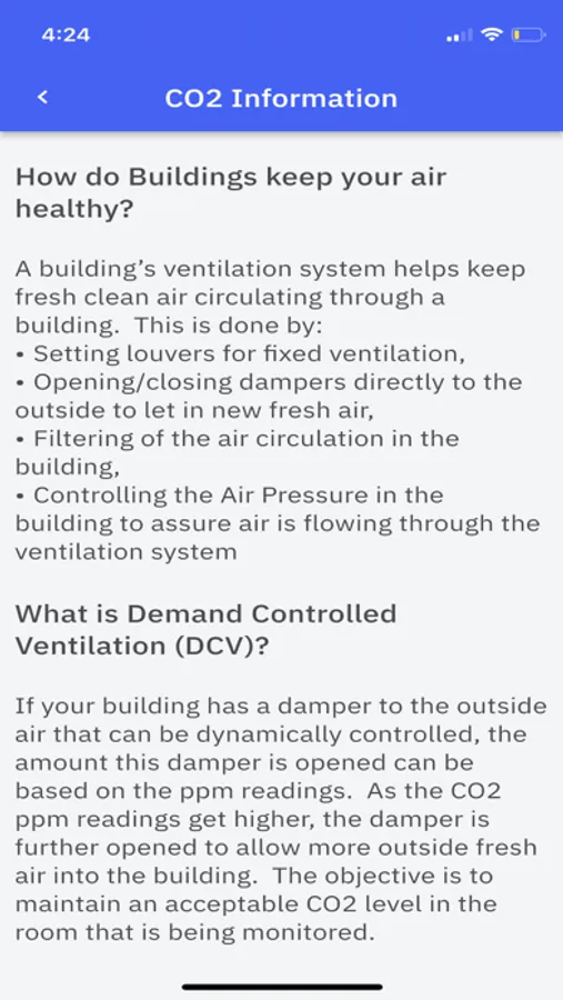 The First page presents the CO2 value on a range that depicts air quality at that particular CO2 reading. This page also includes an Info tab that educates the user about what CO2 is and how this impacts the environment and the user.