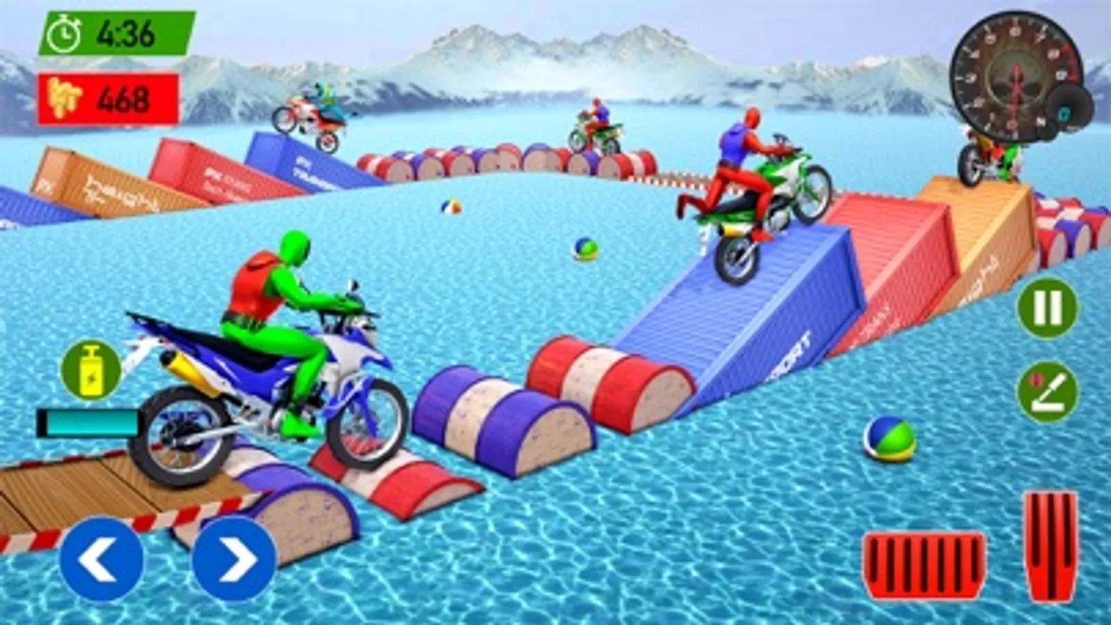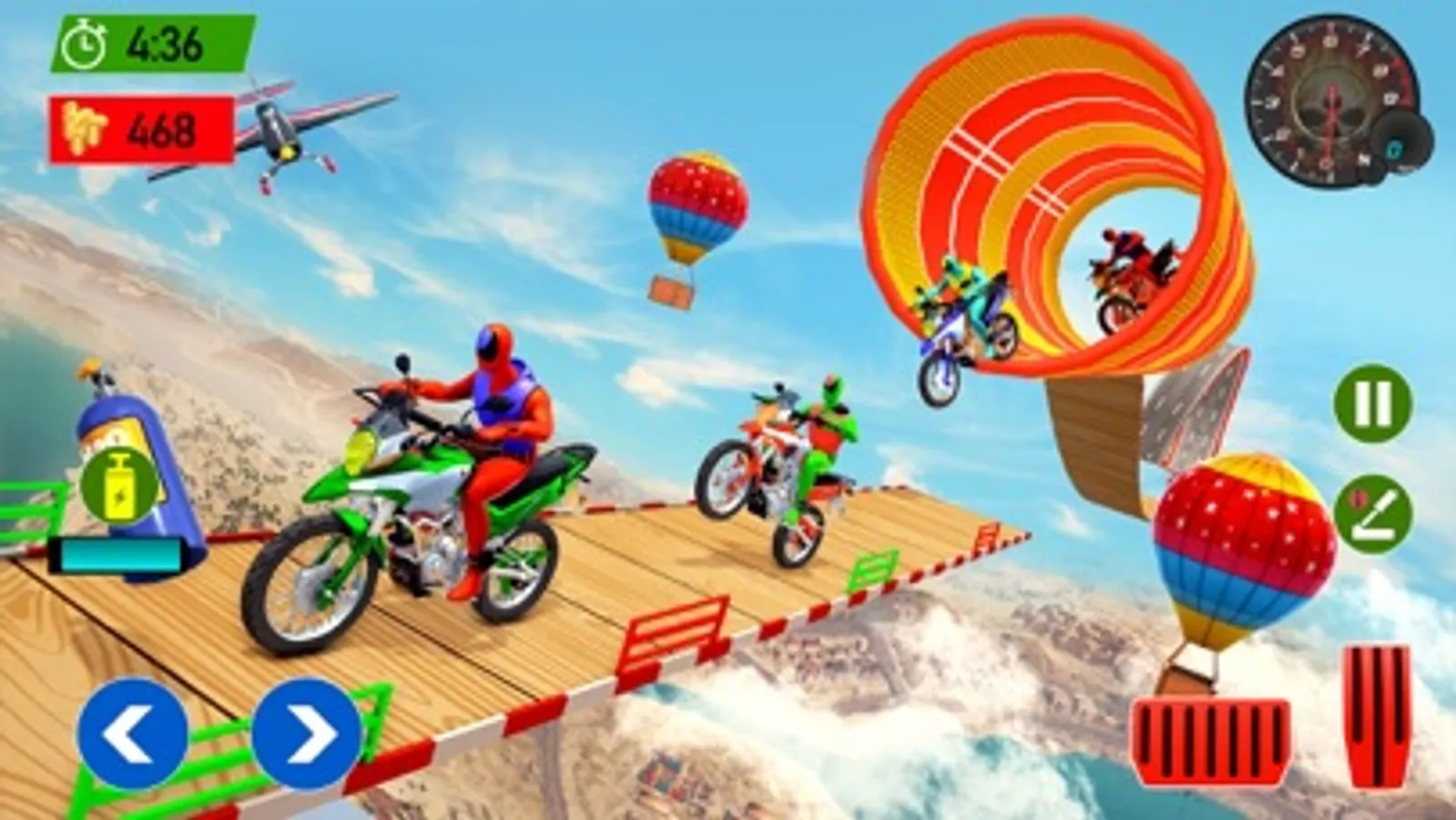 Get ready to engage in the most challenging bike stunts game of this year. You are the superhero with amazing superpowers of spider , captain and the pool hero, your objective is to ride the bike and jump through various challenging stunt platform and show you quality motorcycle riding stunt skills.