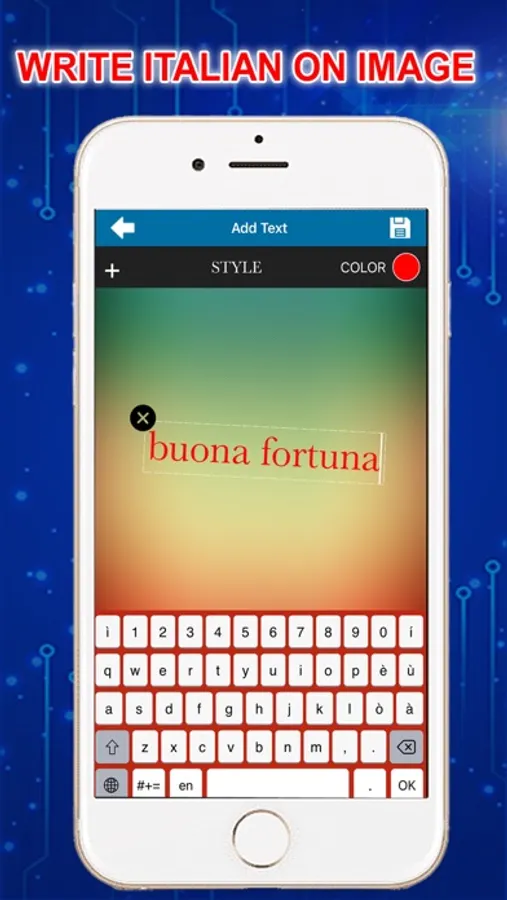This Italian Keyboard is very easy to use. Install it on your phone make Italian keyboard as default keyboard and there you go. Now type in Italian, Write text on your images in Italian language.