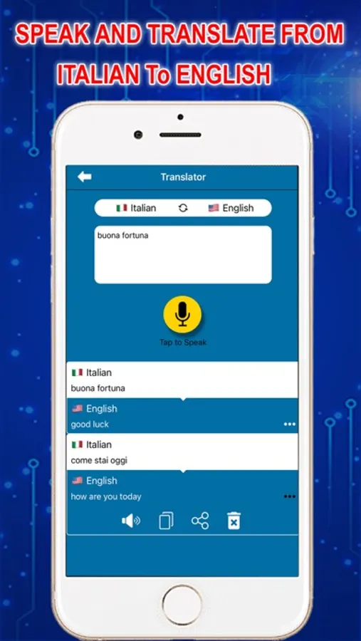 With Speak and Translate in Italian Language you can translate from Italian to English with your voice. Now you can translate anything from English to Italian.