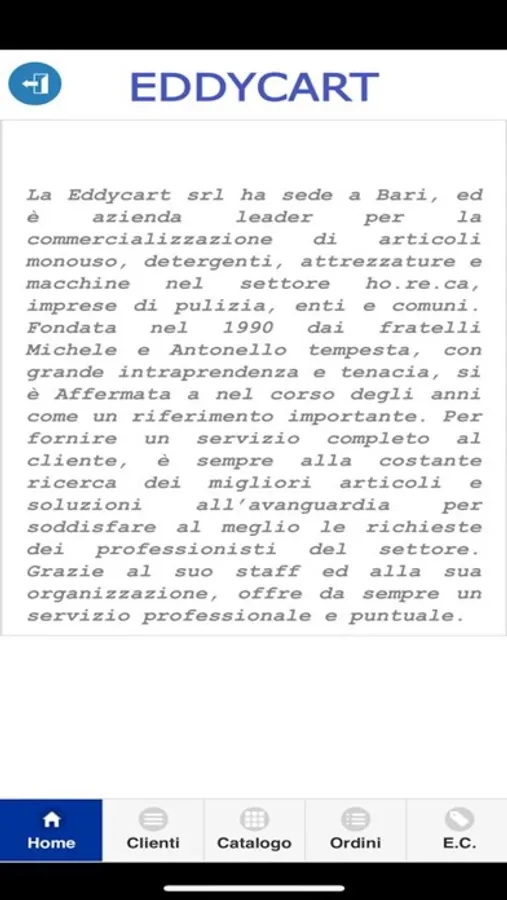 La Eddycart srl ha sede a Bari , ed è azienda leader per la commercializzazione di articoli monouso, detergenti, attrezzature e macchine nel settore ho.re.ca, imprese di pulizia , enti e comuni. Fondata nel 1990 dai fratelli Michele e Antonello tempesta , con grande intraprendenza e tenacia , si è Affermata a nel corso degli anni come un riferimento importante. Per fornire un servizio completo al cliente , è sempre alla costante ricerca dei migliori articoli e soluzioni all’avanguardia per soddisfare al meglio le richieste dei professionisti del settore . Grazie al suo staff ed alla sua organizzazione, offre da sempre un servizio professionale e puntuale .
