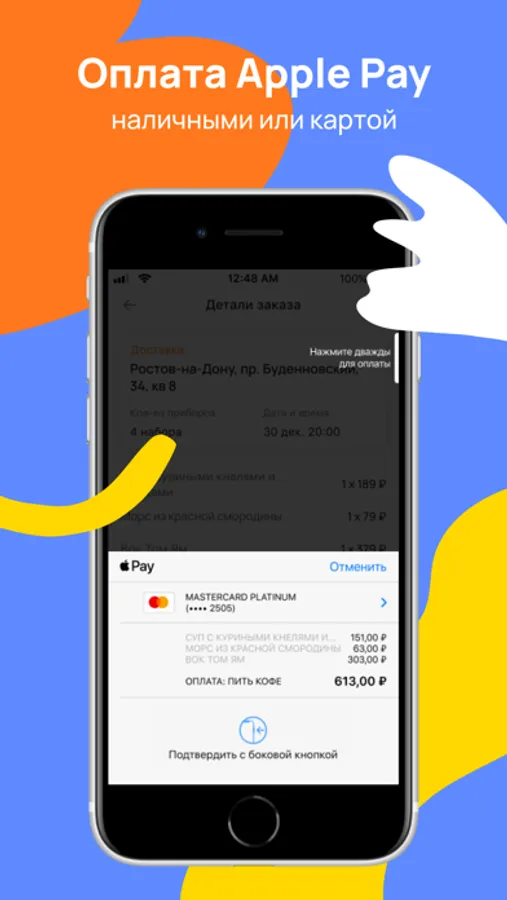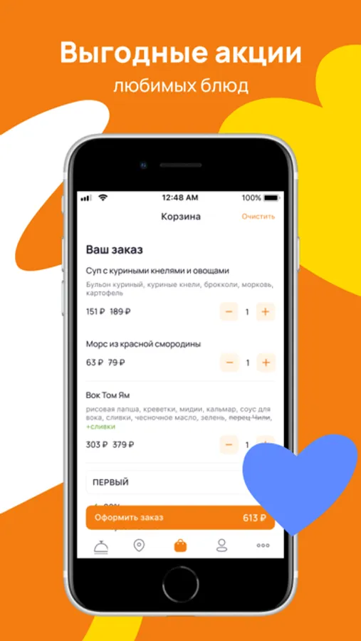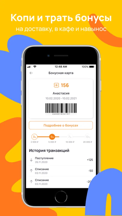 - Возможность копить и тратить бонусы на доставку, в кафе и навынос — оплачивай до 50% заказа баллами!