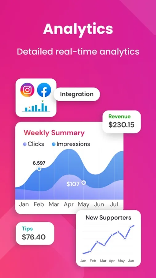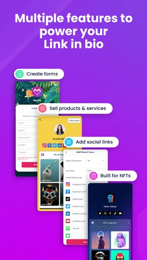 Add links to your social media handles (Instagram, Tiktok, Twitter, Youtube, Spotify), personal website, content pages or Whatsapp using the pre-loaded templates. Choose from a variety of advanced links like shopping link, form link, invoice link or payment link