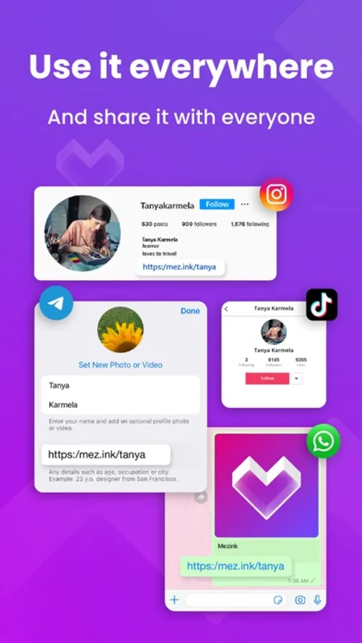 Mezink can be shared on all your social media platforms: Instagram, TikTok, Snapchat, Facebook, YouTube, Pinterest, Twitter, LinkedIn, Twitch, Discord, Booyah, Rooter, Loco, WhatsApp, Telegram, Line, WeChat, or Your Email Signature.