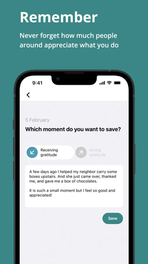 We all experience many moments where we are grateful for something, or someone else is thankful for something we did. With a simple note function, you can keep track of all the gratitude around you.