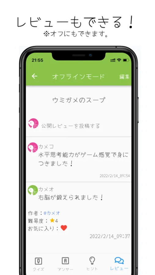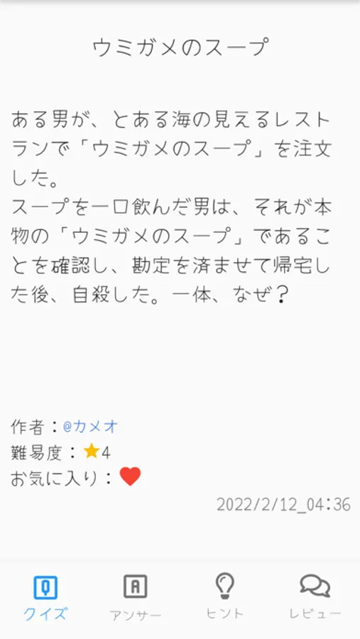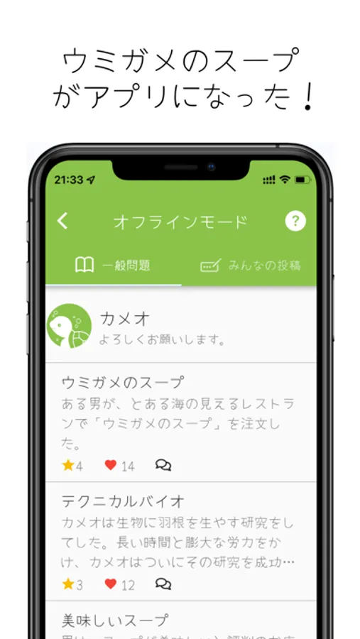 あらかじめ用意されてある『一般問題』と、他のユーザーがオンラインで投稿した『みんなの投稿』から様々なウミガメのスープのクイズが、リスト形式で閲覧可能。