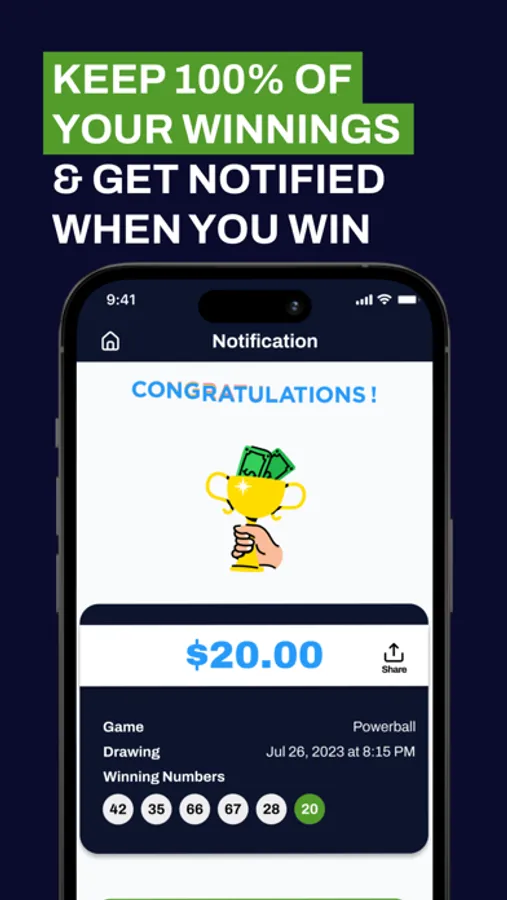 * REAL-TIME UPDATES – Get push notifications as soon as the lottery results have been released, letting you know if you’ve won! You can also set notifications to inform you when jackpots reach a certain size so you never miss another mega-jackpot draw!
