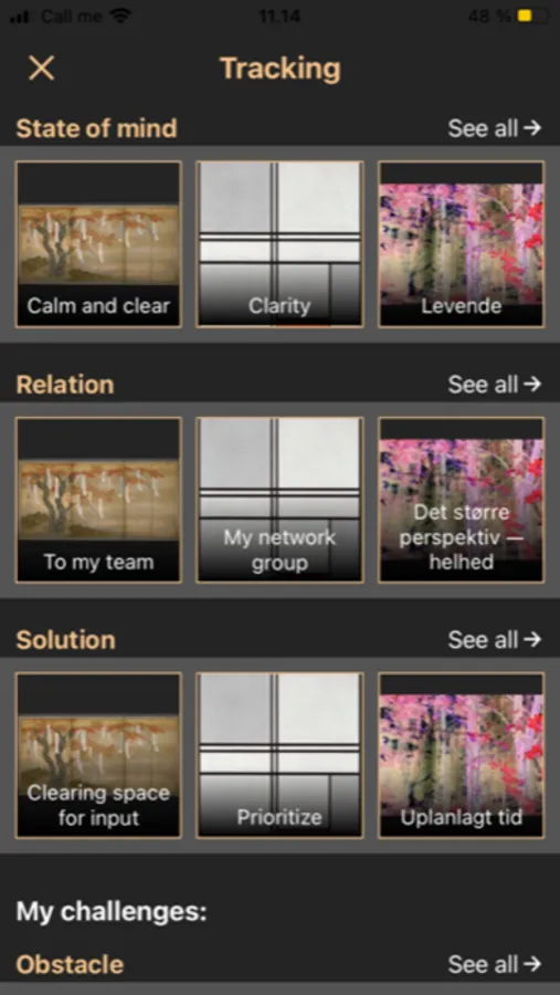 The app is an intelligent visual compass that guides you to access resources such as personal strengths, drivers, relations, and mental states that you can use here and now in a concrete way to live out ambitions and succeed in the face of challenges incl. stress.