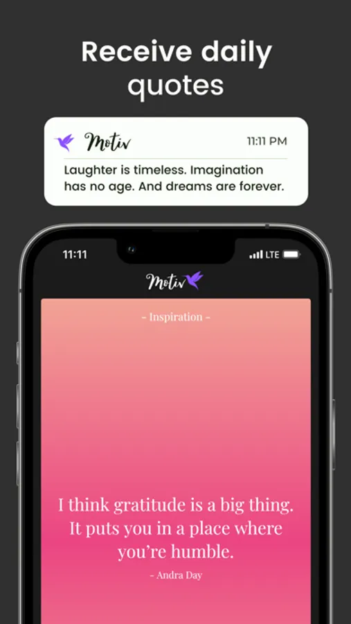 Find your inspiration with Motiv! With Motiv, you will receive motivational quotes to help you find the motivation to be your best self every day. Learn to love yourself and take care of yourself, knowing that you are important and worthy of all the good things life has to offer. Motiv offers thousands of quotes from wise and intelligent people to help you be happy and full of hope.