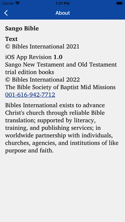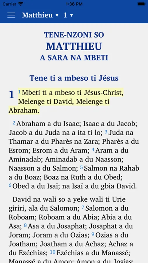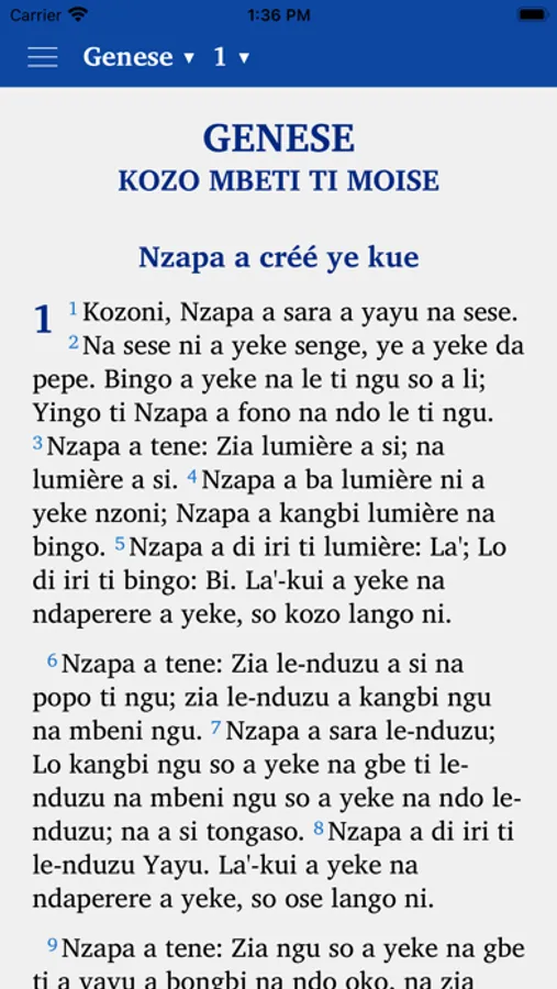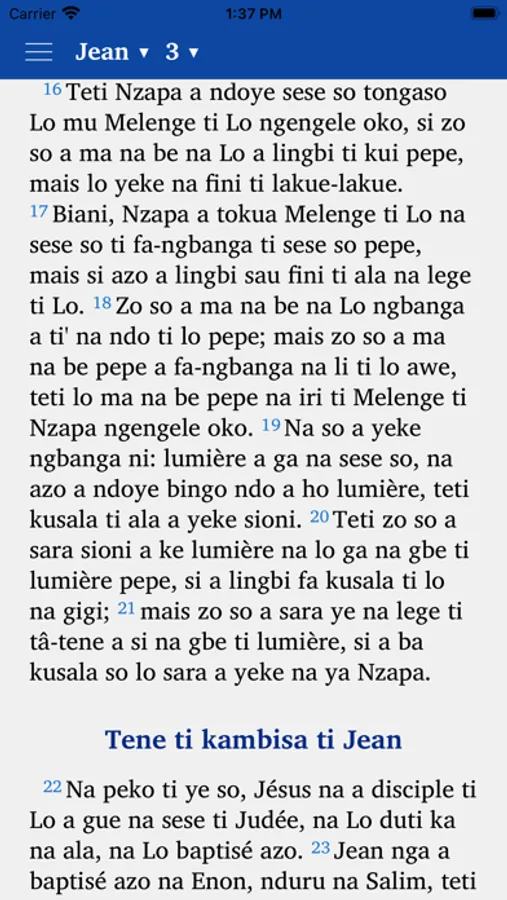 This app provides a translation of the Old and New Testament of the Bible in the Sango language. It is produced by Bibles International, the Bible Society, Translation and Publishing Department of Baptist Mid-Missions.