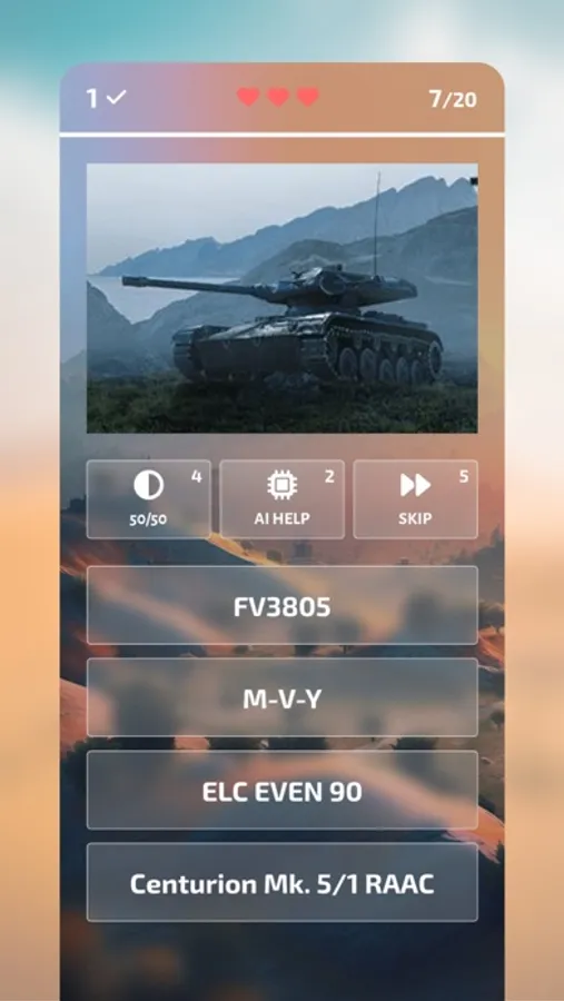 Three types of hints - 50/50, AI Help, and Skip Question - will help you out when you're stuck, but don't rely too much on them because they cost coins. You can earn coins by correctly guessing tanks, and gems by reaching achievements, which you can use to purchase hints or spin the lucky wheel in the internal store.