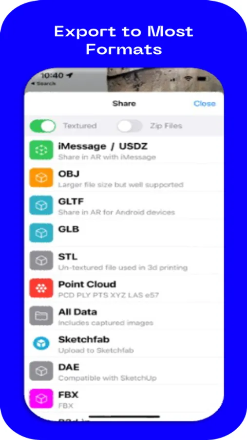 ● Share as USDZ, OBJ GLTF, GLB, STL, Sketchfab, DAE, FBX