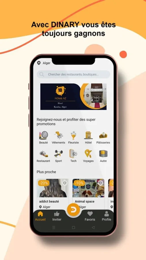 DINARY est une application qui permet à chaque abonné d'obtenir des remise exclusive sur tous ses achats quotidien,des alertes pour tout les remises disponible seront envoyés a nos utilisateurs.