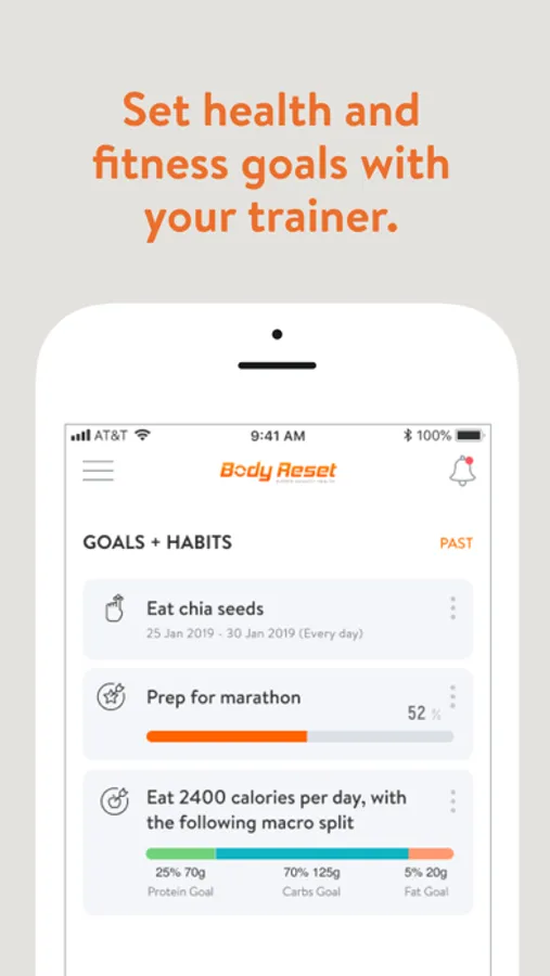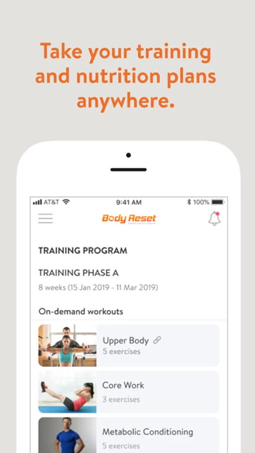 With the Body Reset app, you can start tracking your workouts and meals, measuring results, staying connected to the community and achieving your health and fitness goals, all with the help of your health coach.