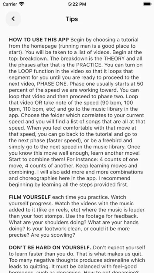 Each tutorial contains a breakdown, followed by practice at slow, medium, and fast speeds. This is how Sri (your instructor) learned to shuffle - starting slow and leveling up to faster and faster speeds. This is the app she wished existed when she started to shuffle!