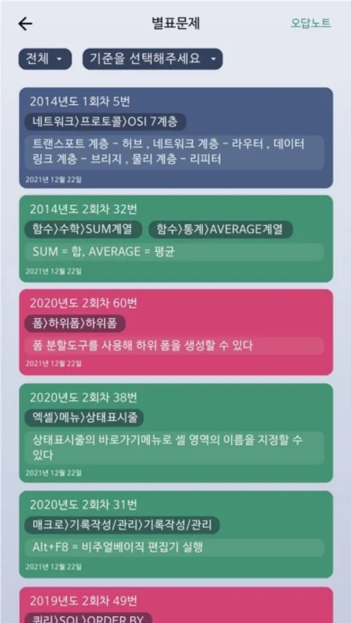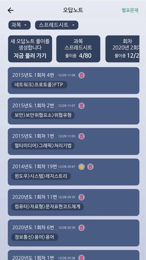 3. 오답노트와 메모장 틀린 문제는 따로 모아서 반복해서 풀어볼 수 있도록 오답노트 풀이 기능을 제공합니다. 중요한 문제는 별표 후 나만의 암기 메모를 추가해서 관리할 수 있습니다.