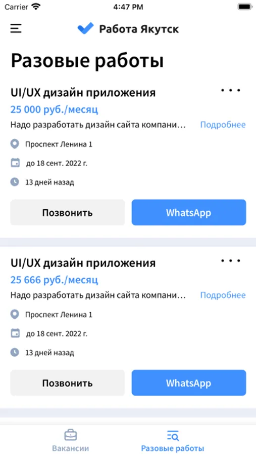 "Работа Якутск" — приложение для размещения и поиска вакансий и разовых работ. Свежие вакансии добавляются в сервисе каждый день на прямую от работодателей. Объявления о работе и подработке теперь доступно в твоем мобильном телефоне.