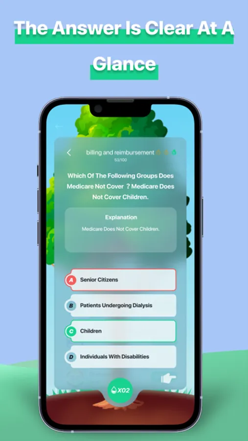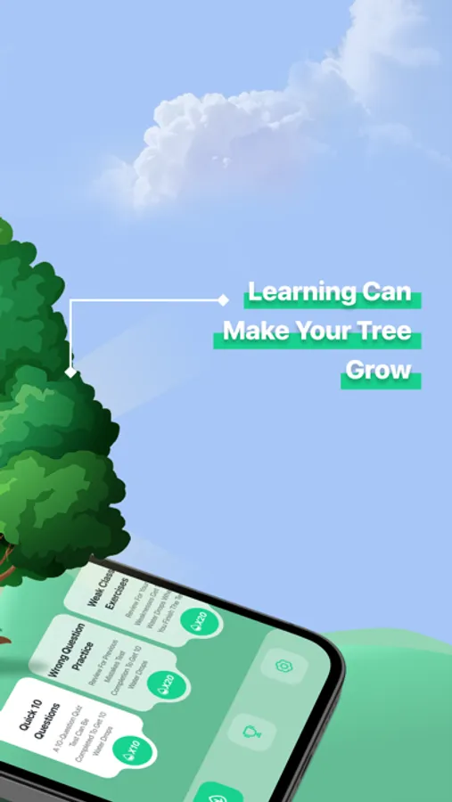 By practising the questions you earn drops of water and then accumulate enough drops to irrigate the little tree until it grows into a big tree, which also means that you have completed almost all the training and you have a high probability of passing the exam easily.