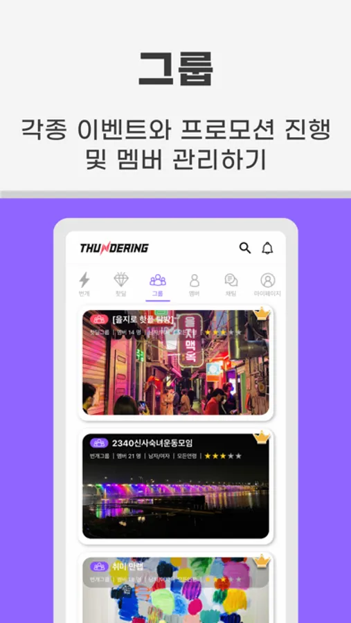 썬더링에서 원하는 모든 종류의 커뮤니티 그룹과 번개를 만들어서 모임을 진행하세요.