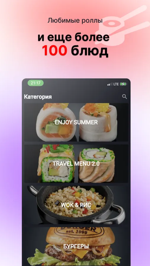 Используйте приложение, чтобы заказать доставку суши, роллов, пиццы, бургеров и пасты на дом или в офис. Пара касаний – и заказ уже готовится.
