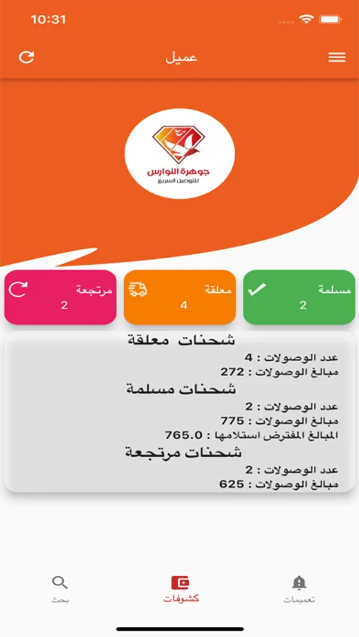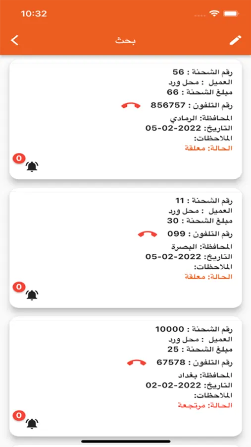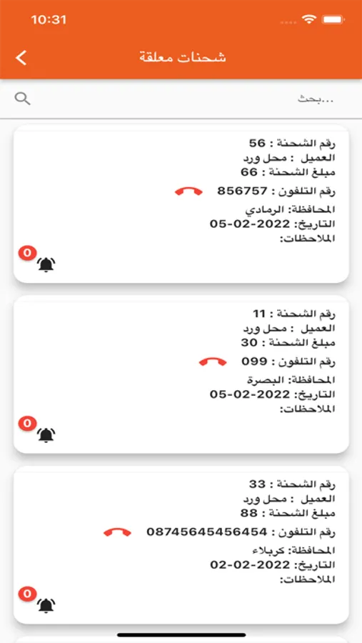واجهة عرض طلبات التوصيل واجراء التسليم والارجاع