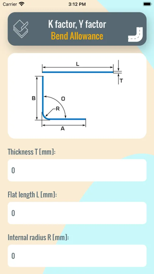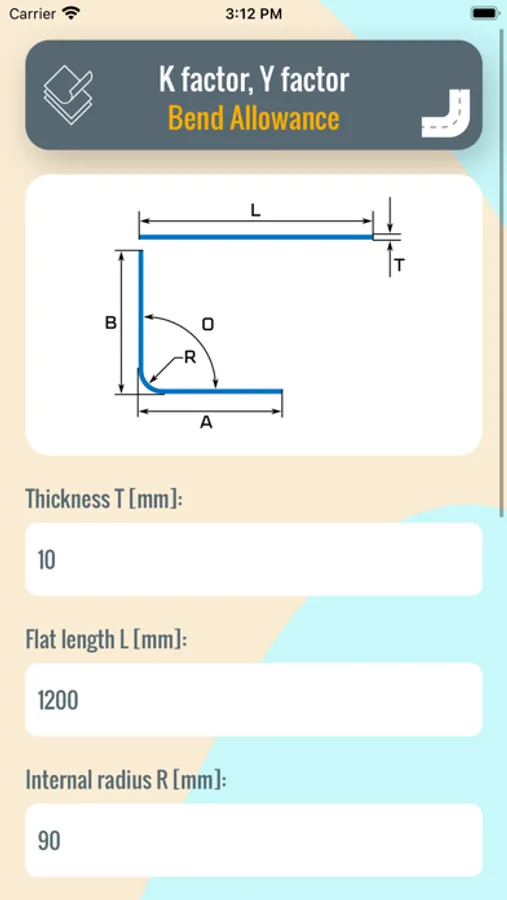 To calculate the bend allowance, the K factor, and the derived coefficient called the Y factor, insert the thickness and initial length of the sheet into the cells on the left. After bending the sheet, insert the inner radius, and flanges A and B. Bending angle is 90°.