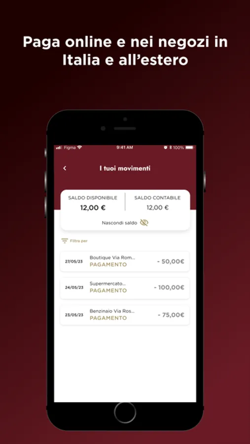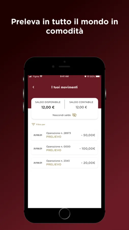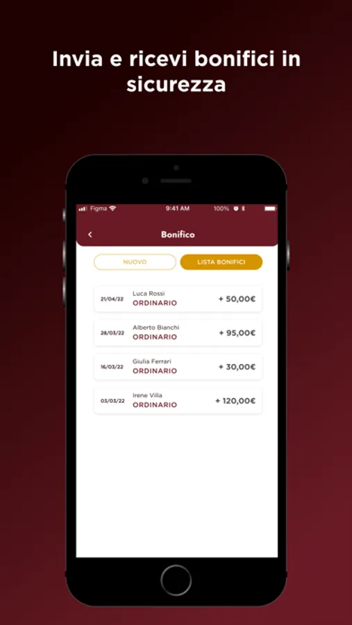 Puoi inviare e ricevere bonifici, tenere sotto controllo il saldo e i tuoi movimenti in pochi e semplici passaggi, tutto direttamente dall'app dal colore granata.