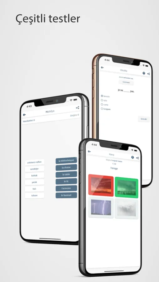 Uygulamanın sunduğu farklı testler hakkında bilginizi sınayın, örneğin: Örneğin, aynı anlama gelen kelimeleri birleştirmek, resimden doğru cevabı bulmak, kelimeyi veya cümleyi tercüme etmek, cümleyi dinlemek ve sonra yazmak, görünen cümleyi ve diğerlerini telaffuz etmek.