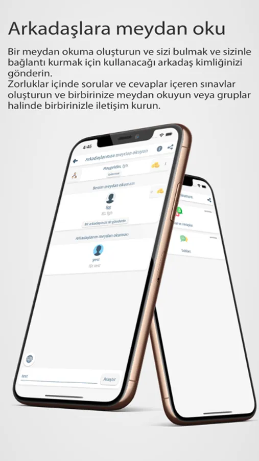 Bir meydan okuma oluşturun ve sizi bulmak ve sizinle bağlantı kurmak için kullanacağı arkadaş kimliğinizi gönderin. Zorluklarda soru ve cevap içeren testler oluşturun ve birbirinize meydan okuyun veya gruplar halinde birbirinizle iletişim kurun.