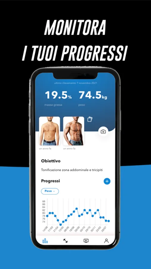 Avrai sempre sotto controllo la tua attività fisica: potrai visualizzare quali esercizi sono previsti nel tuo piano di allenamento, i tuoi progressi e come cambia il tuo fisico nel corso del tempo.
