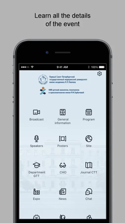 RM Gorbacheva Research Institute is closely connected to Hematology, Transfusion medicine and Transplantation Chair with Pediatric Oncology course, which is named after Institute’s founder, professor Boris Afanasyev. The chair provides postgraduate education programs in pediatric hematology, pediatric oncology and transfusion medicine. This interactive app is an instrument aimed to facilitate the involvement in educational activities, symposiums and conferences organized by RM Gorbacheva Research Institute and Chair.