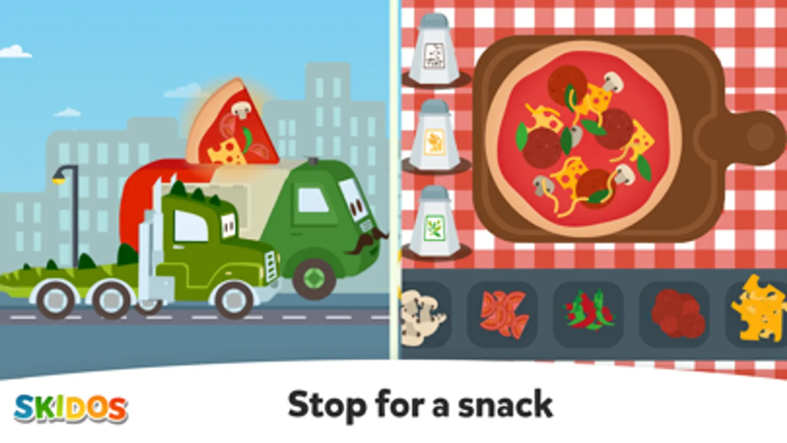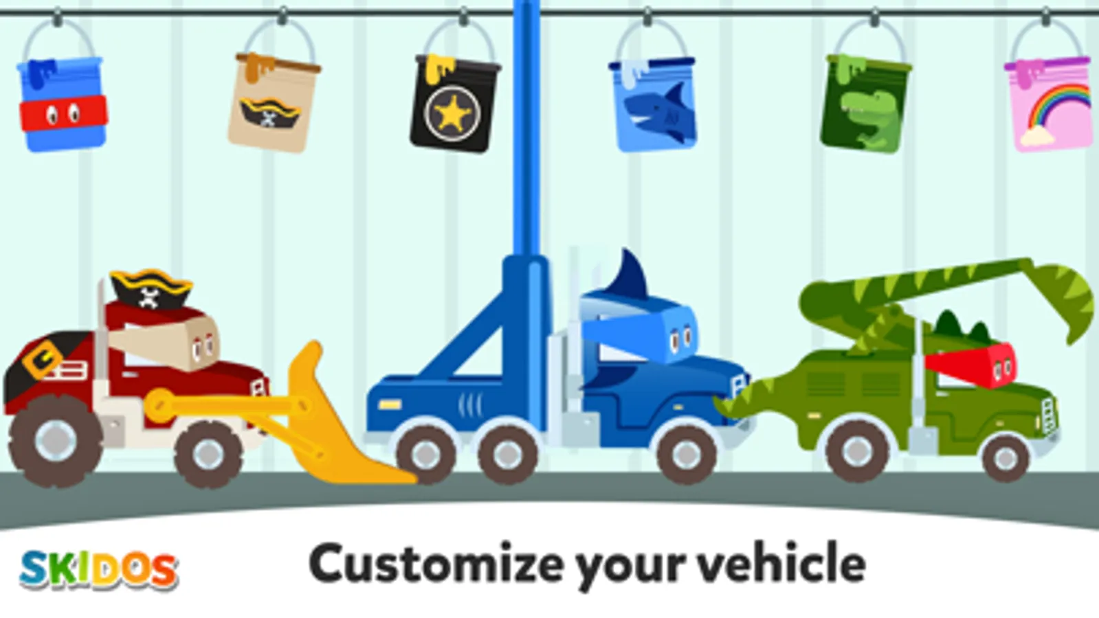 SKIDOS TRUCK is a game suitable for 2+ year olds that let kids play with an excavator, a crane, a bulldozer or a drill truck. Personalize your vehicle, turn it into a pirate, a dinosaur, a shark, a unicorn, and help with the roadworks! Smash rocks, dig tunnels, and repair pipes to help the cute little truck and his friends find their way.