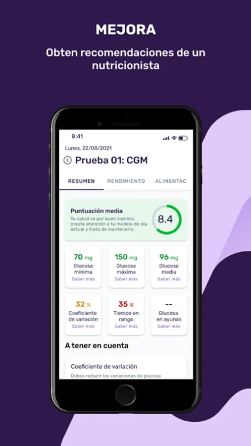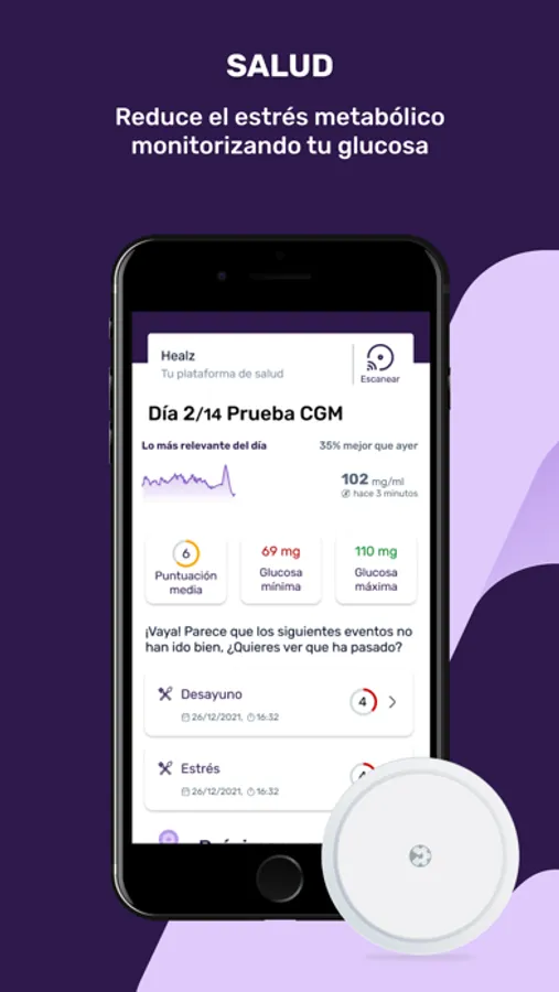 Conecta tu monitor de glucosa continuo para ver cómo tu cuerpo reacciona a tu estilo de vida (Alimentación, Ejercicio, Estrés o Descanso)