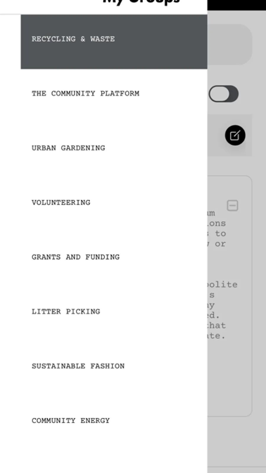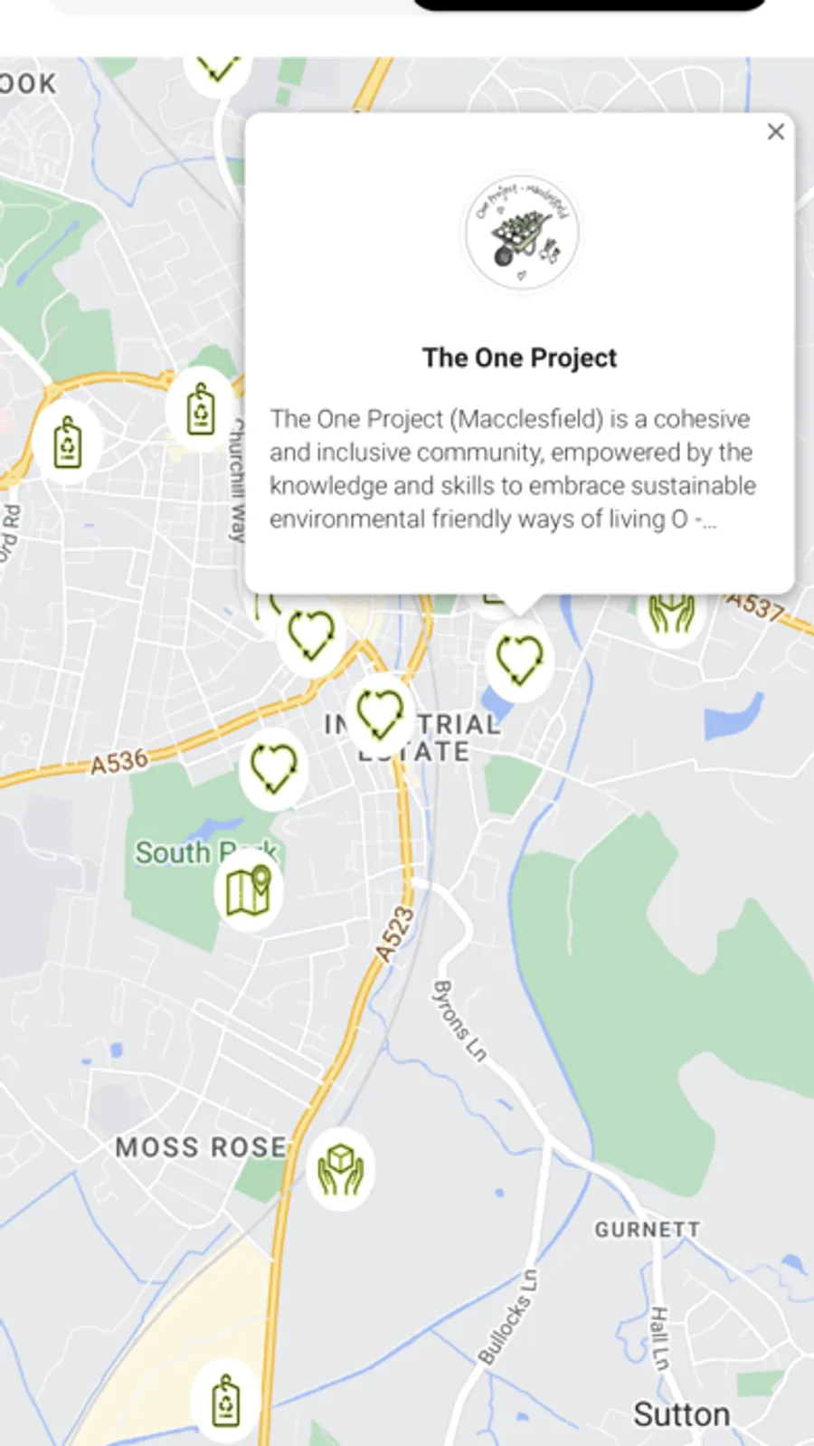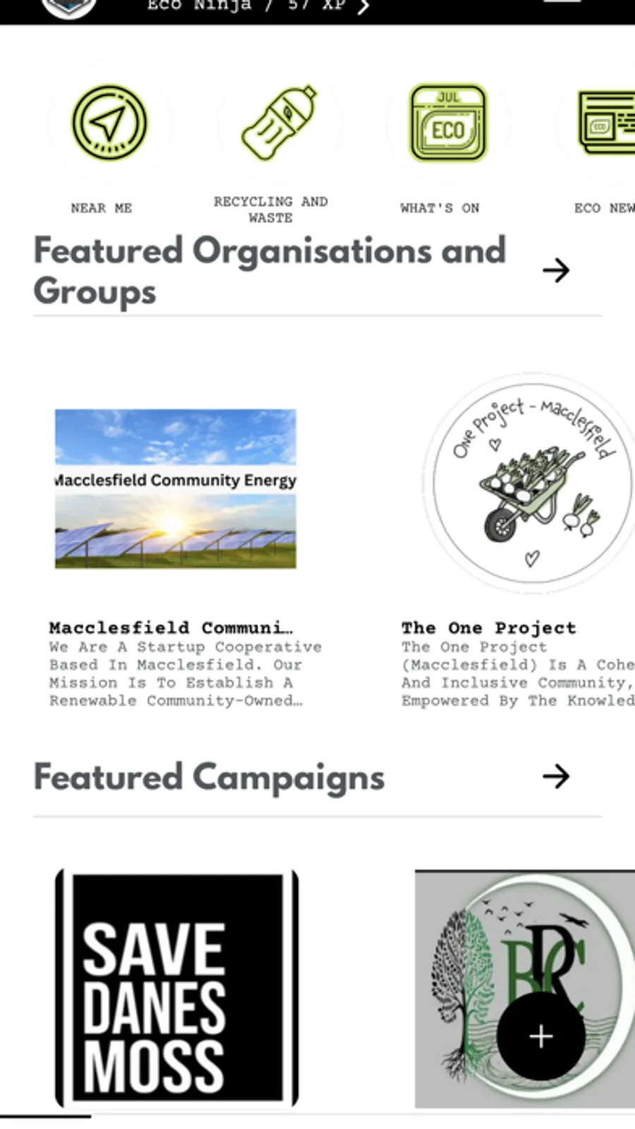 Be able to search locations, organisations, community groups, and events nearby from everything to do with recycling, bio-diversity, green energy, and events like litter picking and urban gathering.