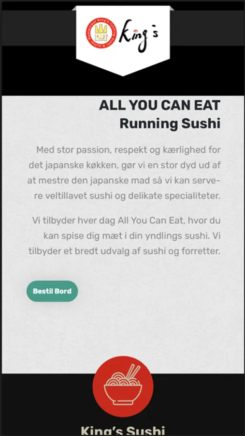 Hjerteligt velkommen til King’s sushi, hvor vi vil forkæle jer med gode smagsoplevelser. Vi har All you can eat konceptet, hvor du kan spise alt hvad du kan.