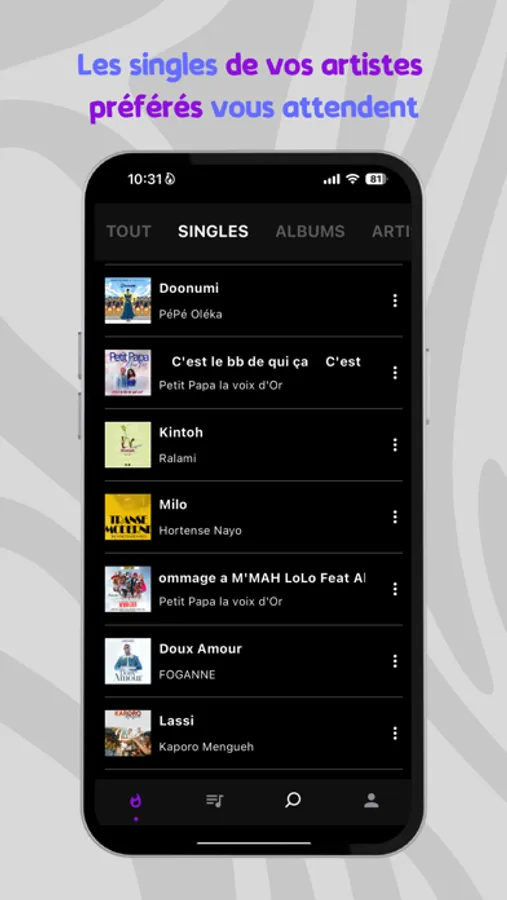 Recherche de contenu : Recherchez et retrouvez facilement vos artistes, musiques, ou albums préférés directement au sein de l’application.