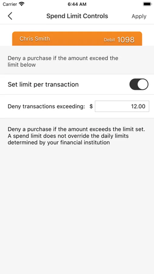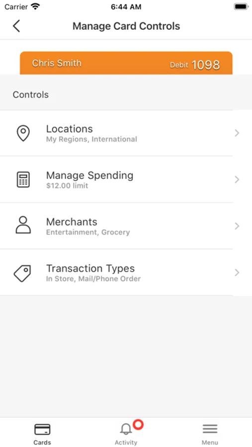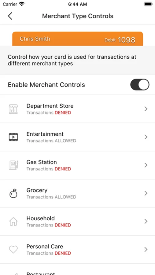 Spending limits can be established to allow transactions up to a certain dollar value and decline transactions when amounts exceed your defined thresholds. Transactions can be monitored and managed for specific merchant categories such as gas stations, department stores, restaurants entertainment, travel, and groceries. And your transactions can also be monitored for specific transaction types: in-store purchases, e-commerce transactions, mail/phone orders and ATM transactions.