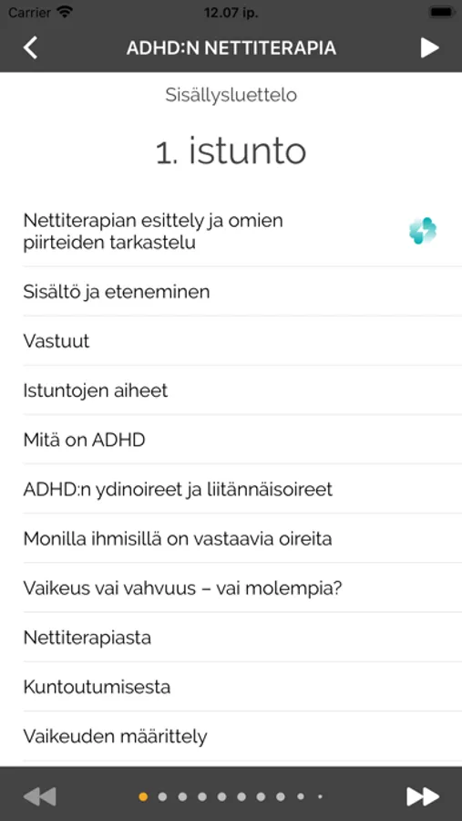 ADHD:n nettiterapian ADHD terapia -sovellus auttaa sinua ADHD-oireidesi hallinnassa. Nettiterapiassa opit ymmärtämään ADHD-piirteitäsi paremmin ja harjoittelet keinoja ADHD:sta johtuvien ongelmien hallintaan. Tukenasi on oma nettiterapeutti, jonka kanssa voit viestitellä sovelluksen kautta. Sovellus on suunniteltu niin, että terapiaasi voidaan yhdistää tulevaisuudessa eri tietolähteitä kuten puhelimen Terveys-sovellus. ADHD:n nettiterapia on tarkoitettu 16+ ikäisille, jotka haluavat laajentaa työkalupakkia ADHD-oireiden parempaan hallintaan.