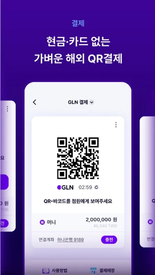 - 연결계좌에서 충전한 머니로 GLN 플레이스에서 QR•바코드로 결제할 수 있어요