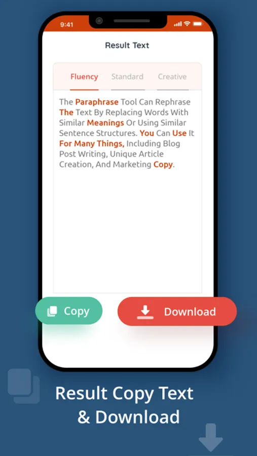 This feature of our app lets you download the rewritten text to the mobile storage only in DOC format.
