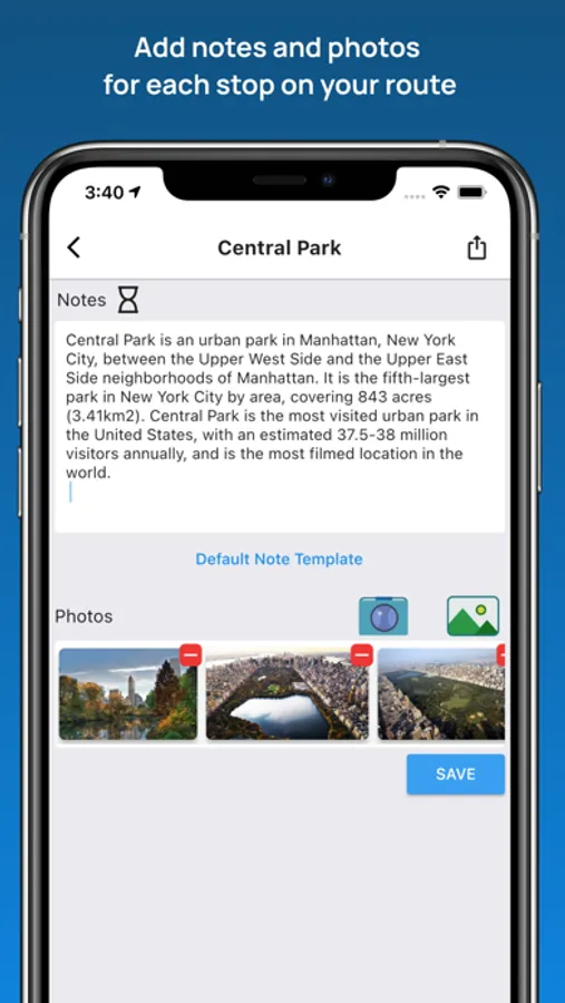 Take notes and photos of your visit to a stop on a route. Share visit details and display past visit data.