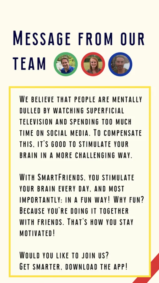 Sometimes feeling mentally dulled from watching superficial television or spending too much time on social media? To compensate for this, it's good to stimulate your brain in a more challenging way. With SmartFriends, you stimulate your brain every day, and most importantly: in a fun way! Why fun? Because you’re doing it together with friends, that’s how you stay motivated!
