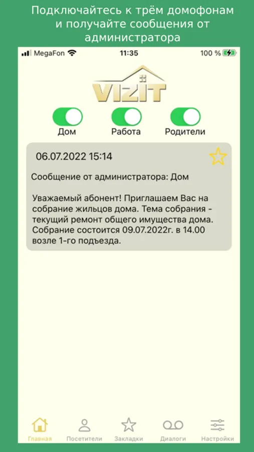 • дублирование звонка с домофона VIZIT на смартфон абонента