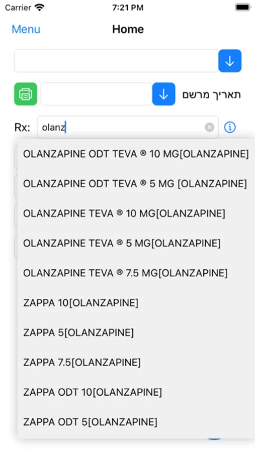 דף Home מאפשר למשתמש לבחור מטופלים אחרונים, עבורם נוצרו מרשמים, ולהוסיף במהירות מרשם חדש ולשלוח אותו למדפסת. רשימה של כל המרשמים האחרונים נשמרת עבור כל מטופל.