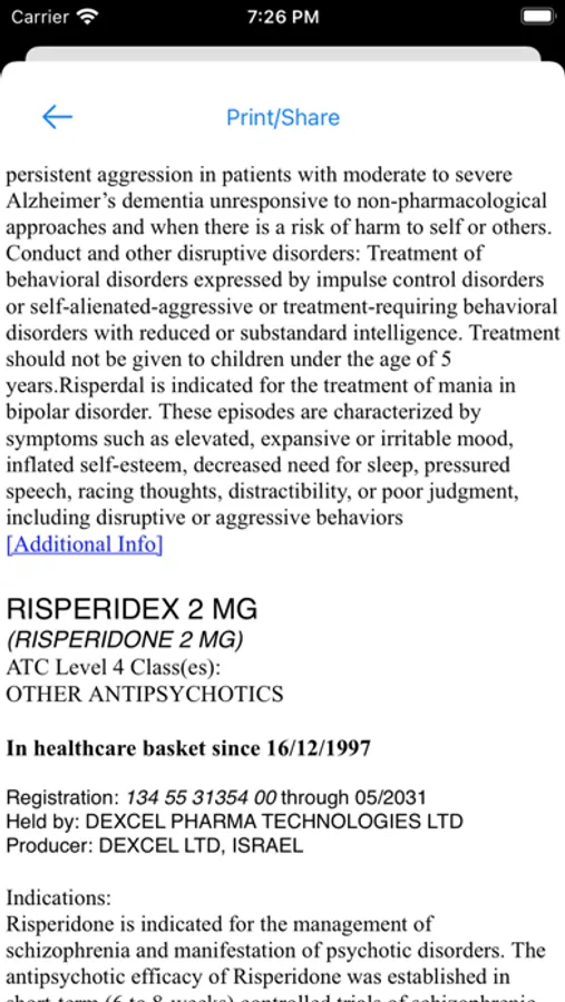 דף Info מציג מידע קצר על התרופה שנבחרה כעת.