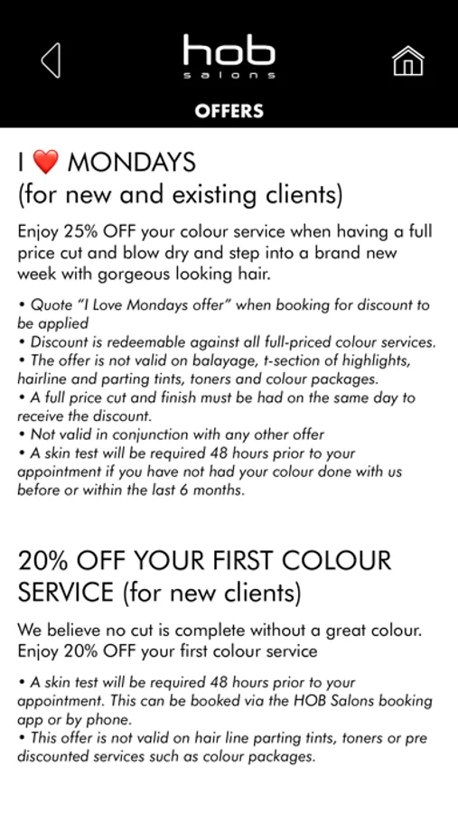 The HOB Salons booking app allows clients to log on and make bookings online under their own profile 24/7. Clients can track loyalty points as well as look at historic and future bookings and get directions for their favourite salon.